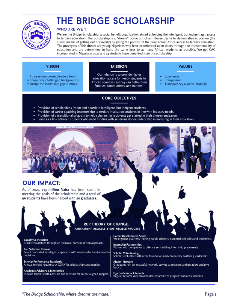 Our mission is to raise empowered men and women from economically challenged backgrounds to better the lots of their families, communities, and nation at large. To achieve this, we are focused on identifying intelligent indigent students and providing for their tertiary education.